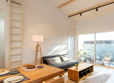 キッチン横の部屋はあえて吹き抜けし、高い位置に大きな窓を設けることで 4.4帖の部屋とは思えない開放的な空間となり、北側でも長時間明るい光が差し込みます。