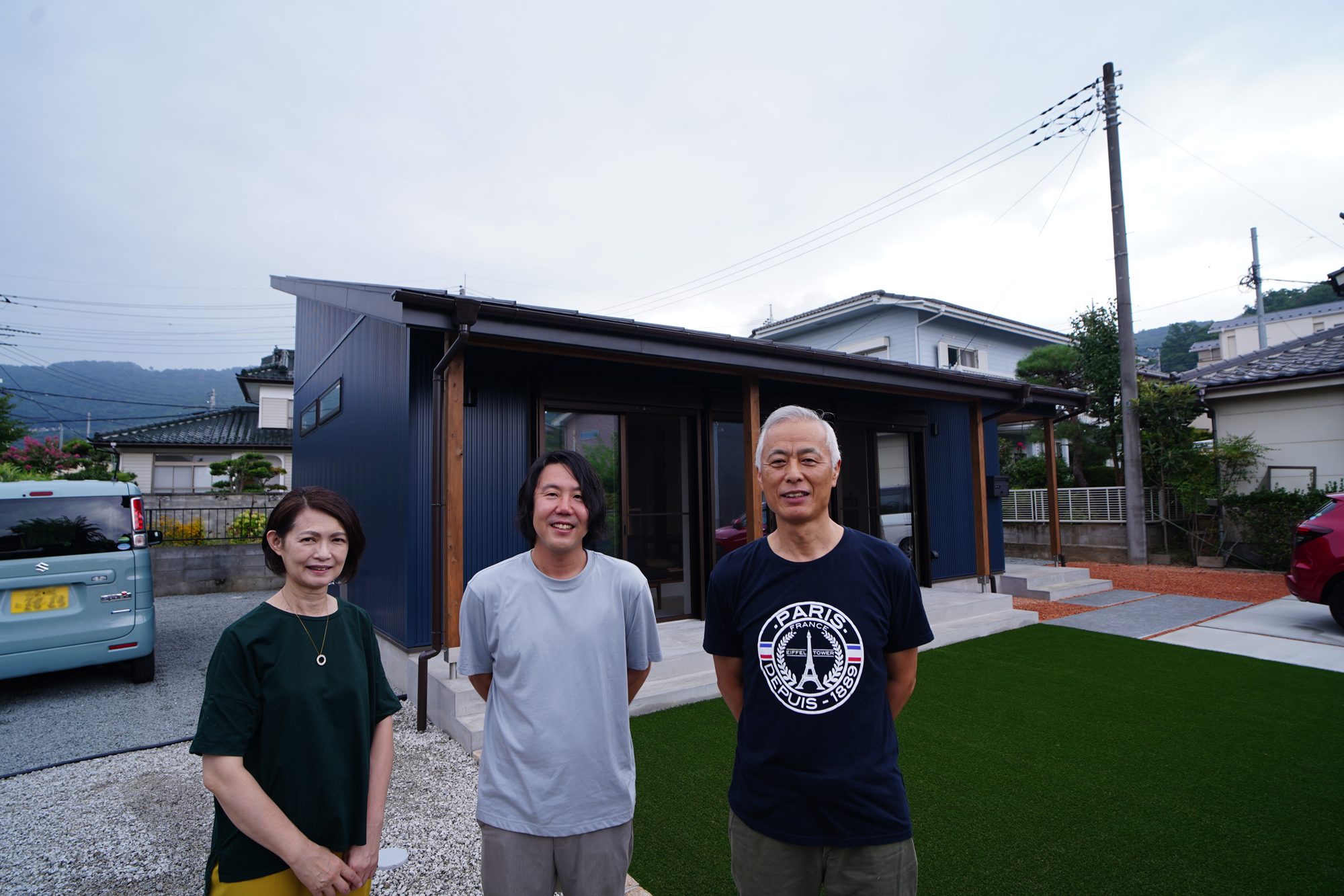 N様:外観的にも こういう家結構建ってますよね今。 町の施設に行く間にも こういう家がいくつかあって こんな感じがいいよねって言ってたところで 割と思った通りの感じだったので 建てる前に私は京都に事業所もあって 特急でいつも福茶山まで行くんですけど 綾部ぐらいの川沿いにですね、こういう同じような外壁の平屋の家があって それをいつもいいなぁと思って。もし機会があったらこんな風にしたいなっていうのはどっかにあったんですよね。